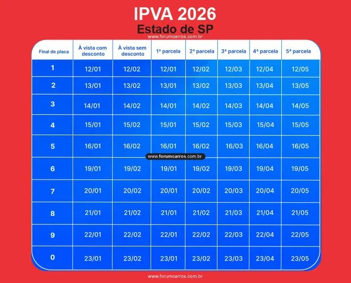 - Rio de Janeiro, com desconto de 3% em datas conforme o final da placa, como o vencimento para placa final 0 até 21 de janeiro de 2026.